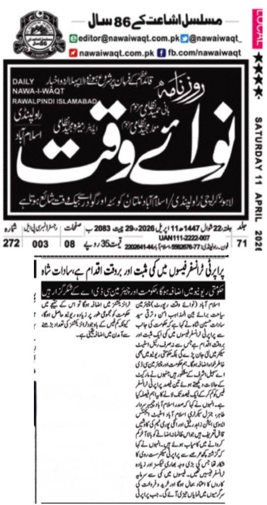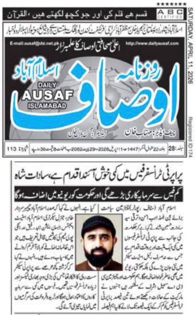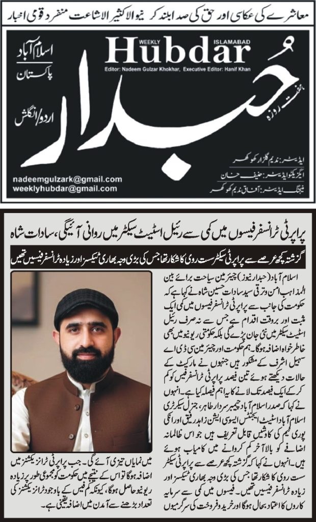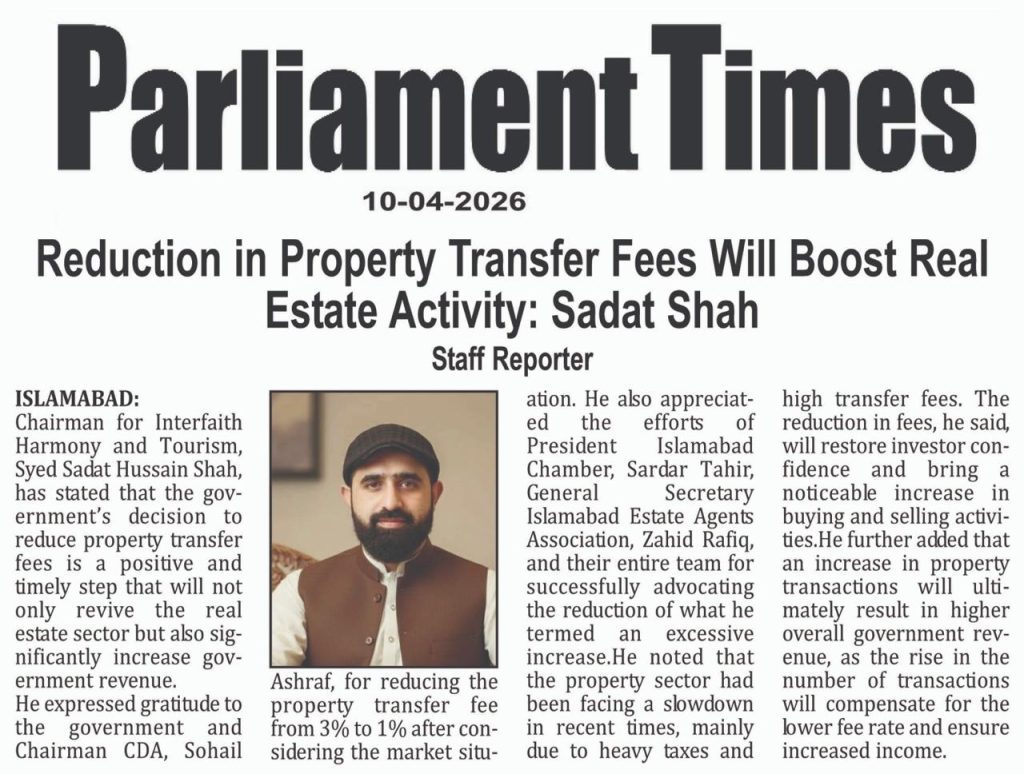 Chairman for Interfaith Harmony and Tourism, Syed Sadat Hussain Shah, has stated that the government’s decision to reduce property transfer fees is a positive and timely step that will not only revive the real estate sector but also significantly increase government revenue. He expressed gratitude to the government and Chairman CDA, Sohail Ashraf, for reducing the property transfer fee from 3% to 1% after considering the market situation.