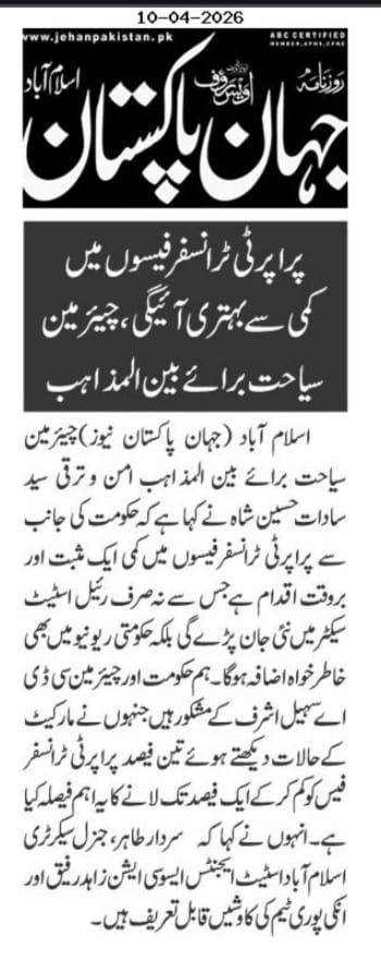 He also appreciated the efforts of President Islamabad Chamber, Sardar Tahir, General Secretary Islamabad Estate Agents Association, Zahid Rafiq, and their entire team for successfully advocating the reduction of what he termed an excessive increase. He noted that the property sector had been facing a slowdown in recent times, mainly due to heavy taxes and high transfer fees.