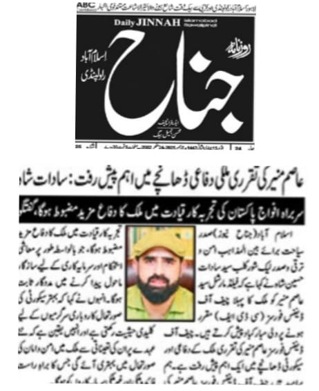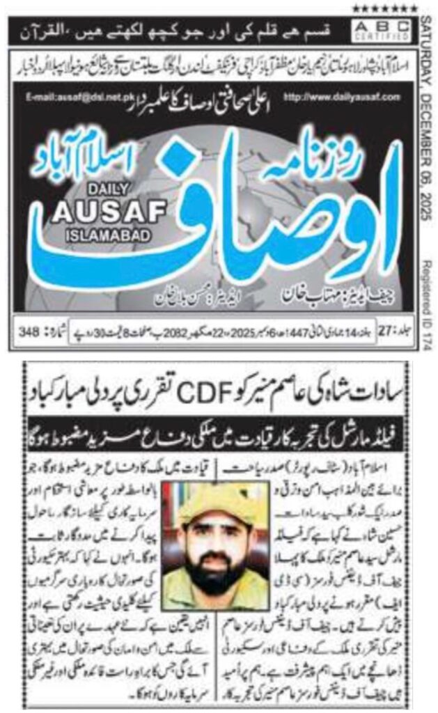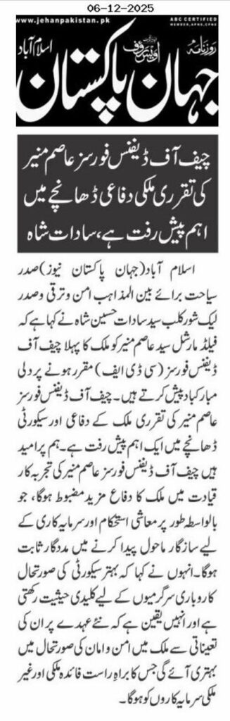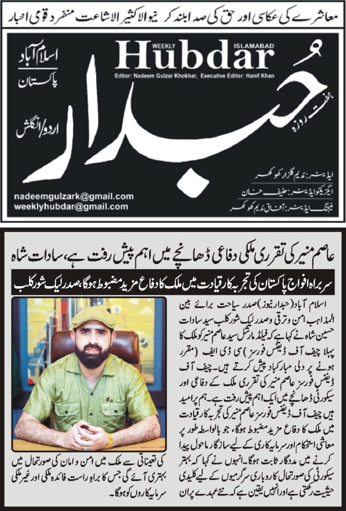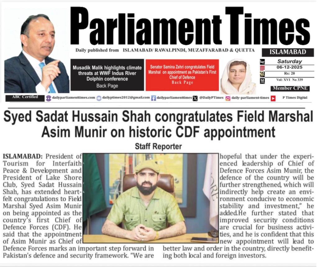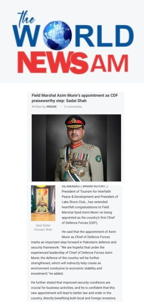 President of Tourism for Interfaith Peace & Development and President of Lake Shore Club, Syed Sadat Hussain Shah, has extended heartfelt congratulations to Field Marshal Syed Asim Munir on his appointment as the country’s first Chief of Defence Forces (CDF).